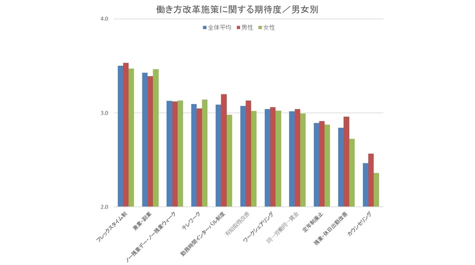 調査では、働き方改革施策として「フレックスタイム」「テレワーク」「兼業・副業の解禁」など11の具体的な施策をピックアップ。20~50代の男女各516名の回答者に、それぞれの施策について期待度の度合いを5段階で尋ねました。