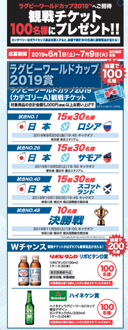 115年の歴史を持つラグビーブランドを日本で展開する株式会社カンタベリーオブニュージーランドジャパン(本社:新宿区、代表取締役:森本 邦夫)は、2019年6月1日(土)から7月9日(火)までの期間、カンタベリー直営店27店舗および全国取扱店520店舗にて、ラグビーワールドカップ2019(TM)の開幕戦や決勝戦などのチケットが当たるキャンペーンを実施します。期間中、ラグビーワールドカップ2019(TM)オフィシャルアパレルなど対象商品5000円(税込)以上お買い上げの方から抽選で、決勝戦などに合計100名様をご招待、さらに抽選にはずれた方からWチャンスとしてリポビタンDまたはハイネケン1ケース(各50本)を各100名様、合計300名様にプレゼント。