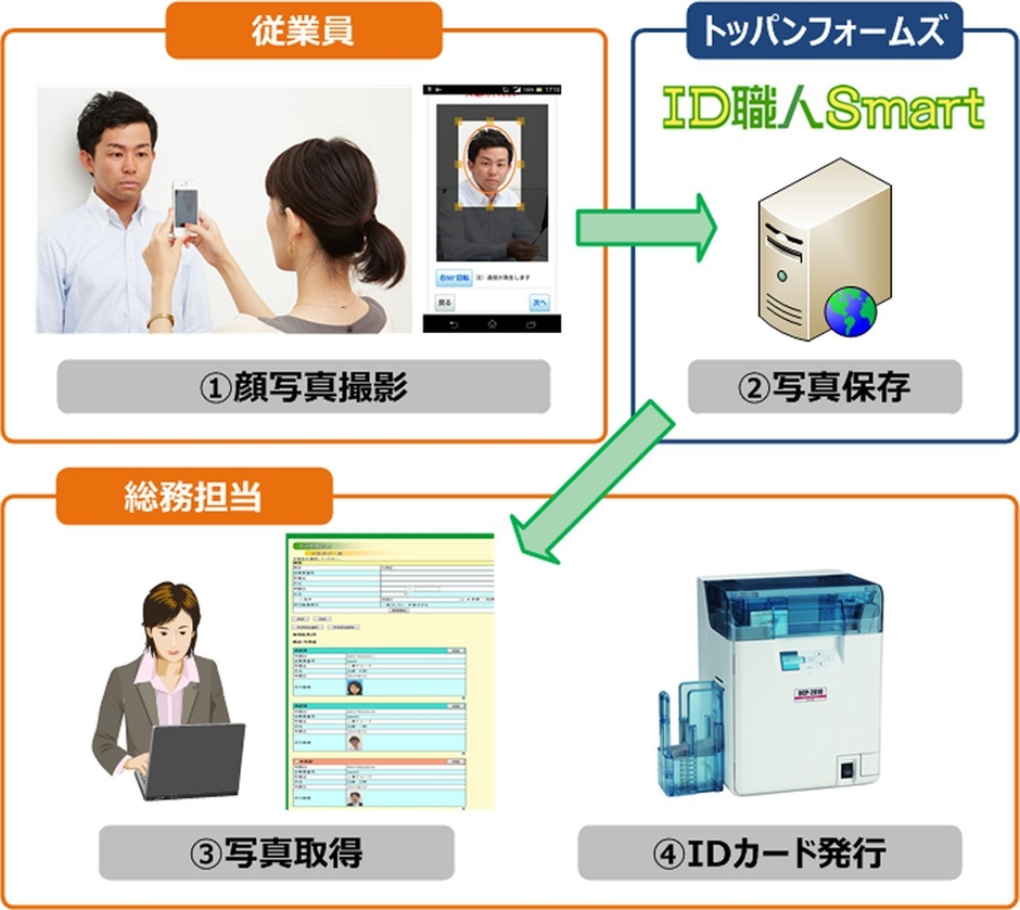 デジタルハイブリッドのトッパン・フォームズ株式会社(以下、トッパンフォームズ)は、IDカードに使用する従業員の顔写真をスマートフォンやタブレットを使って撮影・収集・管理・ダウンロードできる新サービスを2月10日から開始します。専用ウェブサイトに顔写真データをはじめ必要なデータをアップし、カード発行依頼まで一気に完結できるクラウドサービス「ID職人Smart」の新機能として提供します。「ID職人Smart」はこれまでカード発行を大量一括でトッパンフォームズに依頼するケースを想定していましたが、セキュリティ上の理由などにより、自社保有するカードプリンターでカードを発行する際に本サービスで収集した顔写真データが利用可能になります。今後、大量発行の場合はトッパンフォームズに委託、少量発行の場合は自社対応と、必要に応じた使い分けもできます。料金(顔写真登録料)は1件150円です。