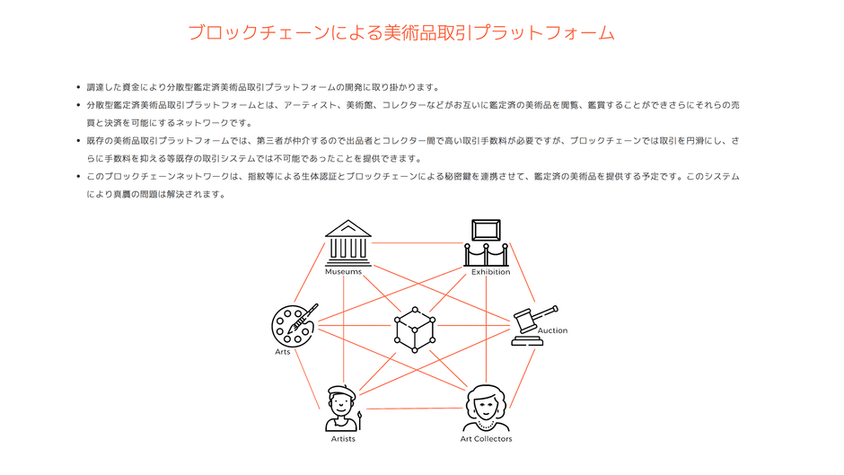 ICOにより調達した資金により、ブロックチェーン技術を使った分散型鑑定済美術品取引プラットフォームを構築します。