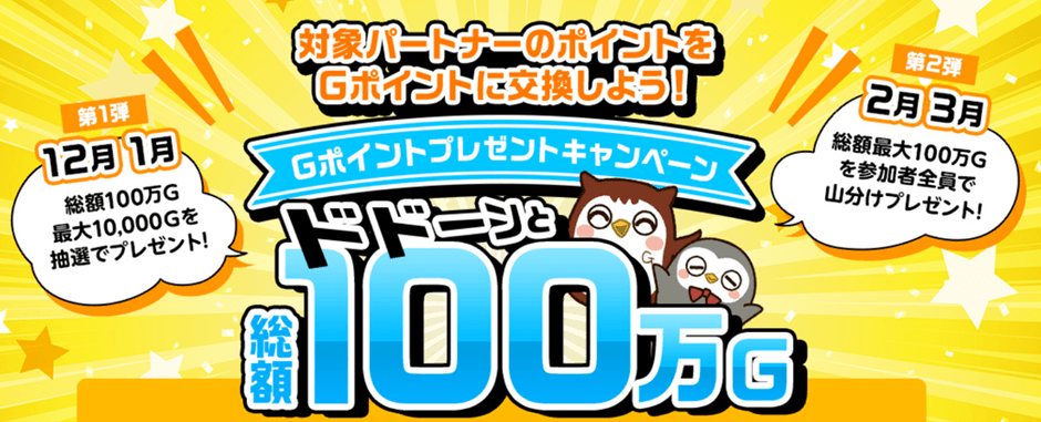 Gポイントでは、2020年12月1日(火)から2021年3月31日(水)まで、「ドドーンと総額100万Gポイントプレゼントキャンペーン」を開催。第1弾・第2弾と2か月ごとにキャンペーンを実施、プレゼント内容も変更となります。それぞれ総額(最大)100万Gが当たる大チャンスとなります。
