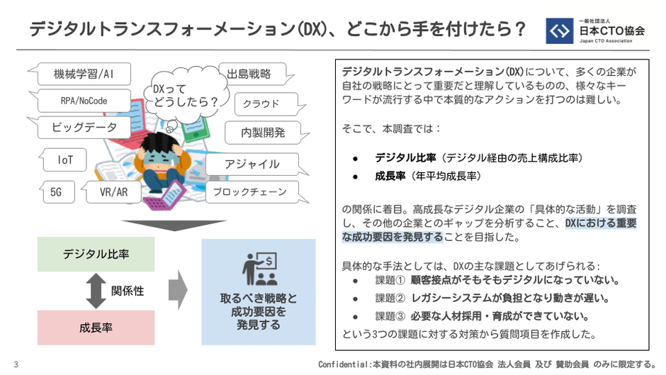 一般社団法人日本CTO協会(本社:東京都渋谷区、代表理事:松岡 剛志、以下:日本CTO協会)は、2021年4月10日(土)「DX動向調査レポート」を発表しました。この調査は日本CTO協会が協会の会員企業や国内のスタートアップから上場企業まで合計1,500を超える企業を対象に実施したものです。分析レポートでは、デジタル比率(デジタル経由の売上構成比率)と成長率(年平均成長率)の関係に着目し、高成長企業の「具体的な活動」について分析し、低成長企業とのギャップを可視化しています。日本CTO協会は4月10日をCTOの日とし、CTO/VPoEが集まるカンファレンス「Developer eXperience Day 2021」を開催しました。今年度は2,514名が参加し、本レポートについても紹介しました。
