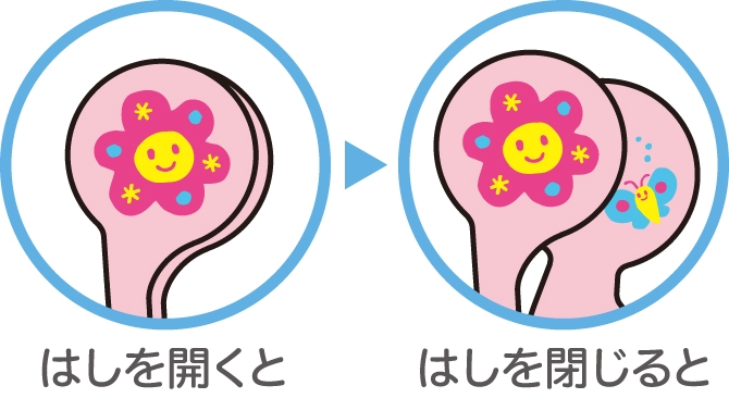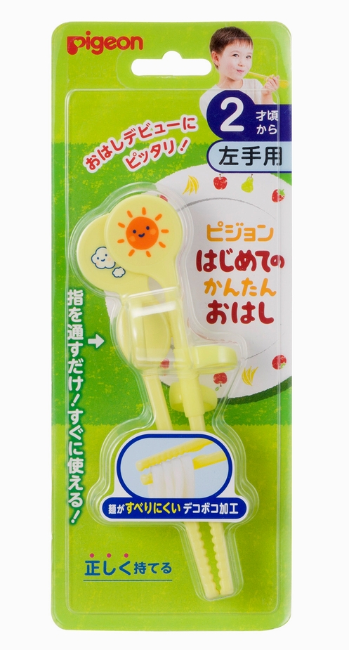 「はじめてのかんたんおはし」は、初めて使うお子さまでもすぐに正しく持てる工夫をしたお箸です。リングに指を通すだけで簡単に使えるので、お箸デビューのお子さまにお勧めです。また、箸先にデコボコ加工を施し、お子さまが大好きな麺類など食べづらいものにも滑らず使えます。そして、お箸を開閉するとかわいい絵柄が出てくる、お子さまが自分から使いたくなる楽しいデザインで、カラーは3種類です。笑顔あふれる親子の食事タイムをサポートします。
