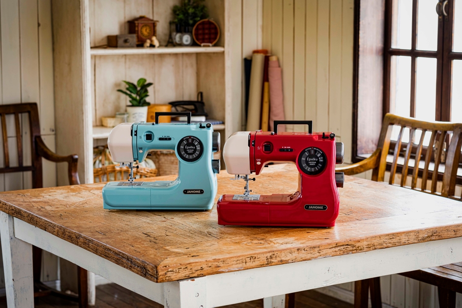 ワークショップでは、創業100周年記念ミシン「Epolku(エポルク)」を使用します。エポルクは、これまで当社が歩んできた時間、時代を共に過ごして来られた多くのお客様への感謝、さらにはこれからの時代もミシンでモノづくりの楽しさを伝えていきたいとの思いを込めてお届けするミシンです。100周年を記念した特別なロゴプレート、こだわりのボディカラーなど、インテリアに馴染むレトロな外観が魅力です。
