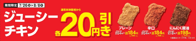 期間限定ジューシーチキン3品本体価格から20円引きセール! お見逃しなく!ジューシーチキン(プレーン・辛口・にんにく醤油)7月26日(金)~8月8日(木)実施