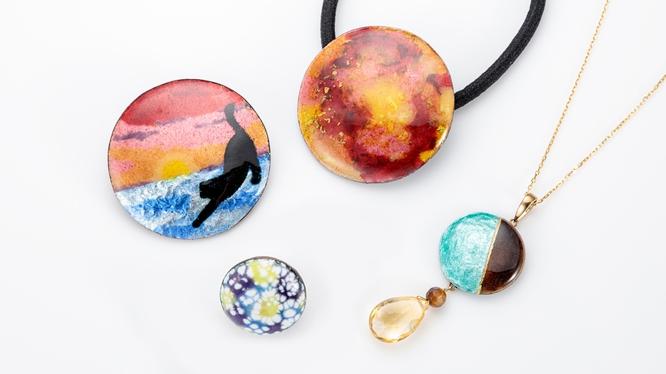 日本伝統技法の七宝DIY(手作り)。ヘアゴム、ペンダントトップ、ブローチ、ピンバッジなど