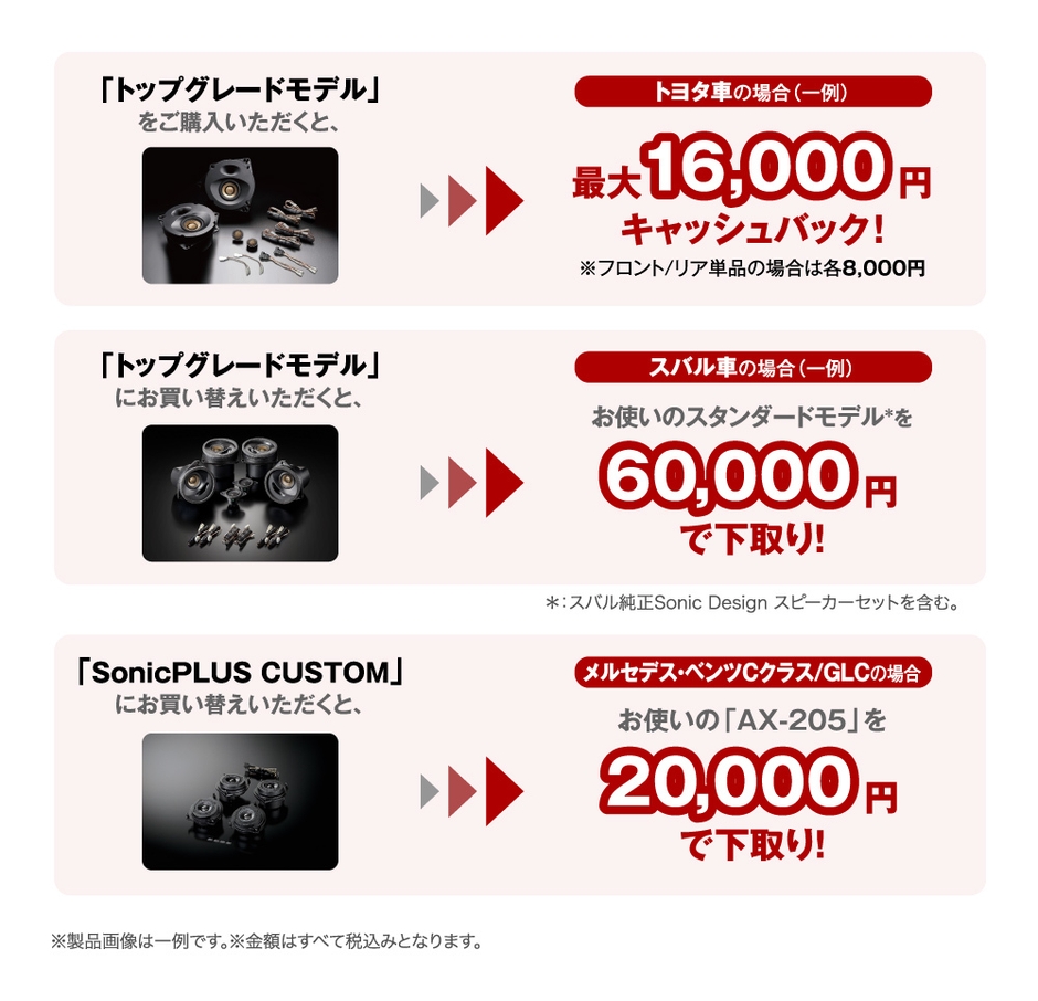 現在、「SonicPLUS スタンダードモデル」および「スバル純正Sonic Design スピーカーセット」をお使い*1で、新たに「SonicPLUSハイグレードモデル」または「SonicPLUSトップグレードモデル」*2への買い替えをご希望のスバルオーナーを対象に、期間限定の特別価格で下取りします。下取り金額は、お買い上げ時期や使用期間に関わらず、下記金額となります。