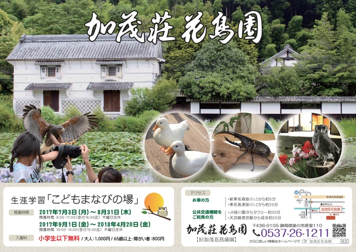 加茂株式会社(本社:静岡県掛川市、代表取締役:加茂 登志子)が運営する加茂荘花鳥園では、『生涯学習 こどもまなびの場』と題したイベントを、2017年7月3日~8月31日まで開催いたします。本年で2回目となる昆虫展の開催、今年より本格化した猛禽類・フラミンゴ・クジャク・コールダックのショーの継続により、夏休みに大人も子どももお楽しみいただけるイベントとなります。
