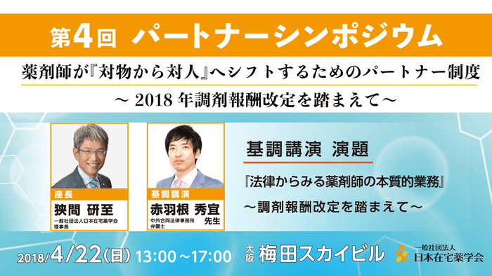 4回目を迎える本シンポジウムでは、法的な観点からみた、調剤報酬改定を踏まえた薬剤師の本質的な業務や、実際にパートナーを活用し、パートナーの存在が必要不可欠になっている薬局の事例などをご紹介いたします。