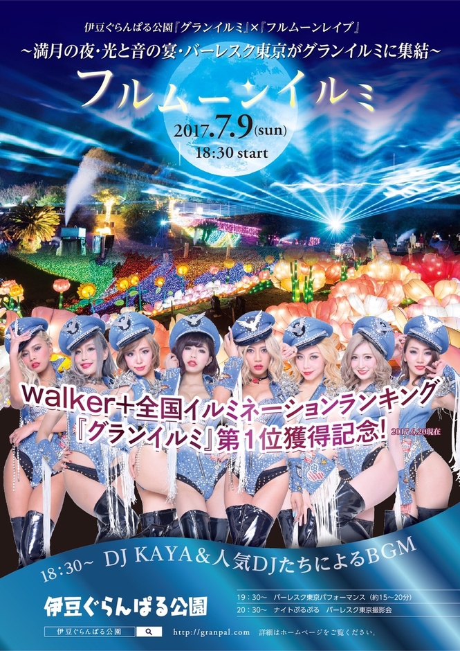 当イベントは、2017年6月9日に新木場「ageha」にて3,000人以上動員した話題沸騰の「フルムーンレイブ」メンバーがグランイルミの「夢のお菓子エリア」に再集結し、DJ KAYAと人気DJたちによるBGMと今話題の東京NO.1エンターテインメント集団「バーレスク東京」のパフォーマーたちが、フルムーンイルミを盛り上げます。また、今夏初オープンとなる夜のウォーターランド「ナイトぷるぷる」での撮影も予定しております。
