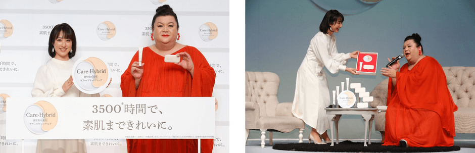 新CMに出演しているマツコさんが登場。オファーが来た時の気持ちを聞くとマツコさんは、「CMオファーが来たとき、資生堂は46歳のおっさんになにやらせるんだろうって驚きました。今まで、資生堂のCMには新しい“気づき”みたいなものを受けてきたので、今回起用いただけて大変光栄です。」と話しました。それが『薬用ケアハイブリッドファンデ』のCMと分かって、「”ほぼぬっている“と言っていいぐらい毎日ぬっていて、ファンデーションをずっと使っているという自信があるんです。日本人はちょっとうすい気がするの・・もっとぬった方がいいと思うのよね」とファンデーションに対する熱い想いも語りました。