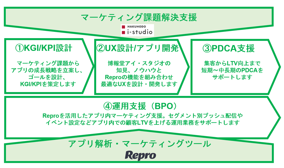 博報堂アイ・スタジオが培ってきたクリエイティビティ、アクセス解析やユーザーテストなどの活用による最適なUXの設計、クリエイティブ制作、アプリの改善に関するノウハウの蓄積、高速PDCA(UI改善、施策企画など)、新規アプリ開発、Reproによるアプリマーケティングツール提供、データ分析に基づいた成長戦略策定や収益改善支援、新規アプリ企画支援ノウハウと統合することで、アプリユーザーに最適な体験を提供し、企業のマーケティング課題解決に貢献します。