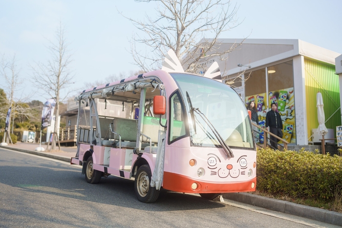 本車両は、土日祝日限定で10:00~17:00にF駐車場と「クレヨンしんちゃんアドベンチャーパーク」を往復する専用車両です。最大7名まで乗車が可能で、約5分で目的地まで移動することができます。車両はしんちゃんたちが通うふたば幼稚園のバスを模しており、作品の世界観に浸りながらアトラクションまでの道中をお楽しみいただけます!