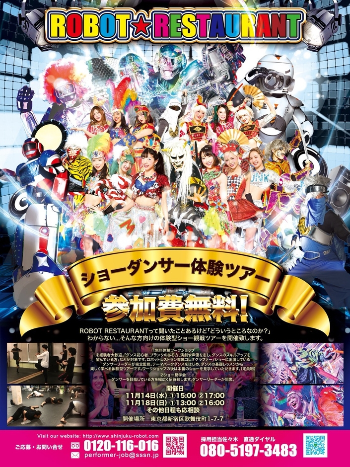 ロボットレストラン(場所:東京都新宿区)では2018年11月14日(水)、18日(日)にショーダンサー体験ツアーと称した、ダンスを主としたワークショップを開催いたします。