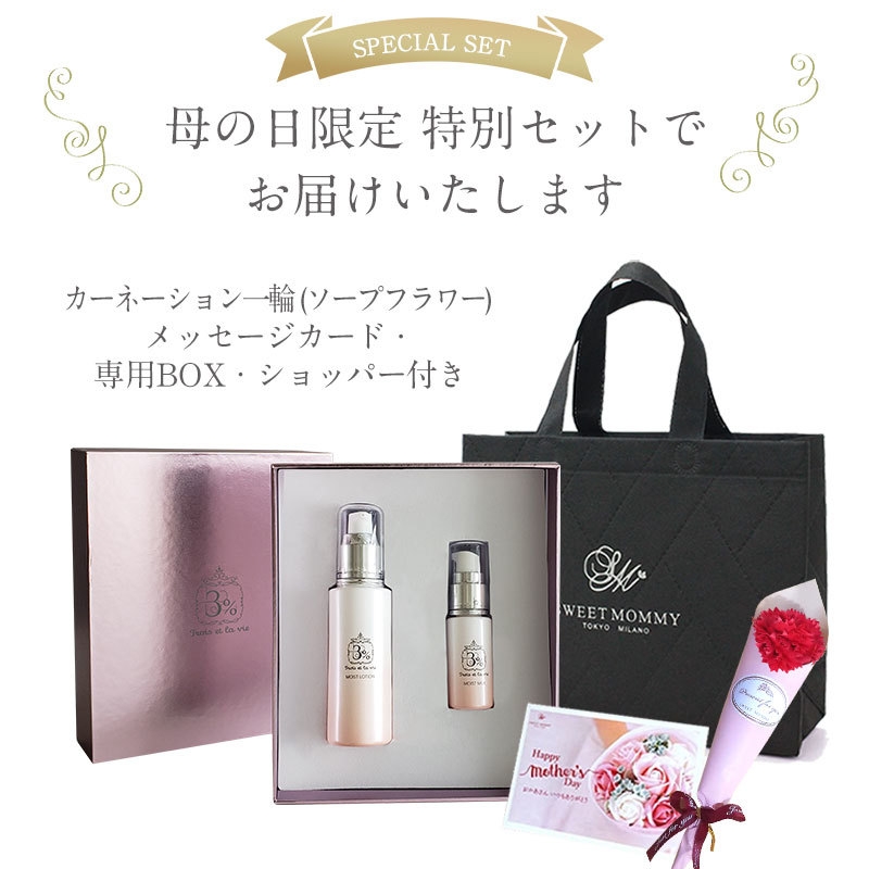 内容 : 化粧水(50mL)、乳液(15mL)、カーネーション(一輪)ソープフラワー