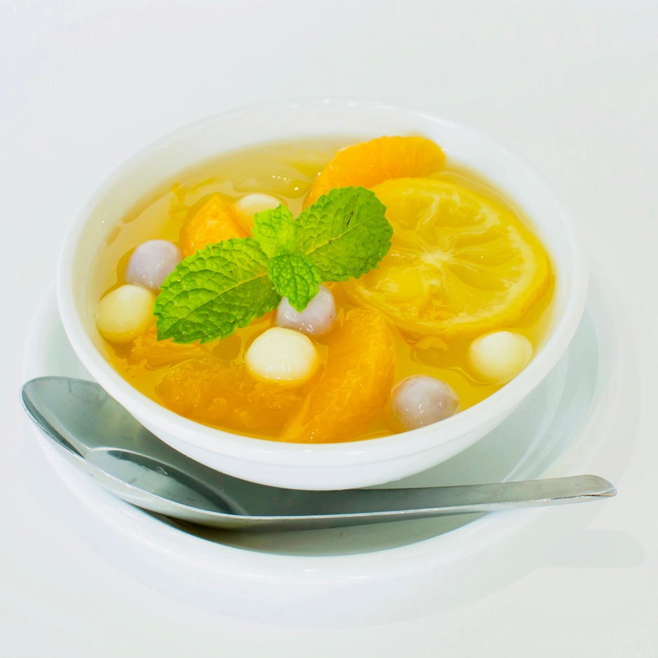 瀬戸田のノーワックスレモンを使用した爽やかな柑橘あんみつです。