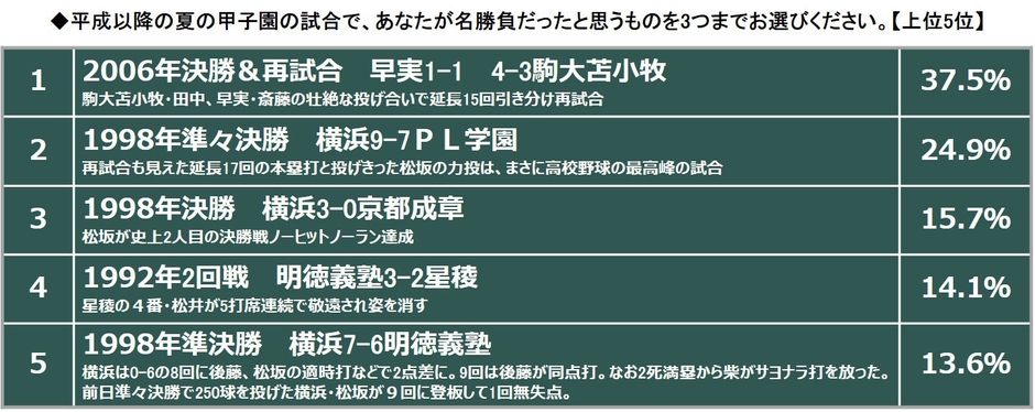 ◆平成以降の夏の甲子園の試合で、あなたが名勝負だったと思うものを3つまでお選びください。【上位5位】