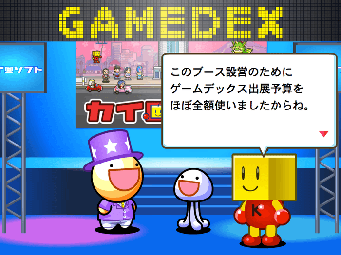 ゲームデックスという展示会に出展することになったカイロソフト社とカイロくん。初出展なので頑張って立派なブースを作ったものの、ついつい予算を使いすぎてしまい、イベントスタッフを雇うお金を残しておくのを忘れてしまっていました。