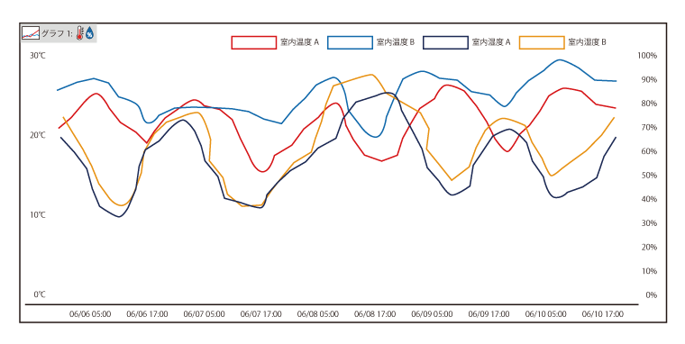 - 1チャート当たり、二種類のセンサ出力値を同時に表示することができ、最大2チャート(4センサデータ)を同じ画面内に表示します。温度と湿度、温度と日射等、WD100シリーズで提供する各種センサの出力を時間軸上で同時にグラフ化して表示する機能をもち、それぞれの要素の関連性などの比較が可能です。