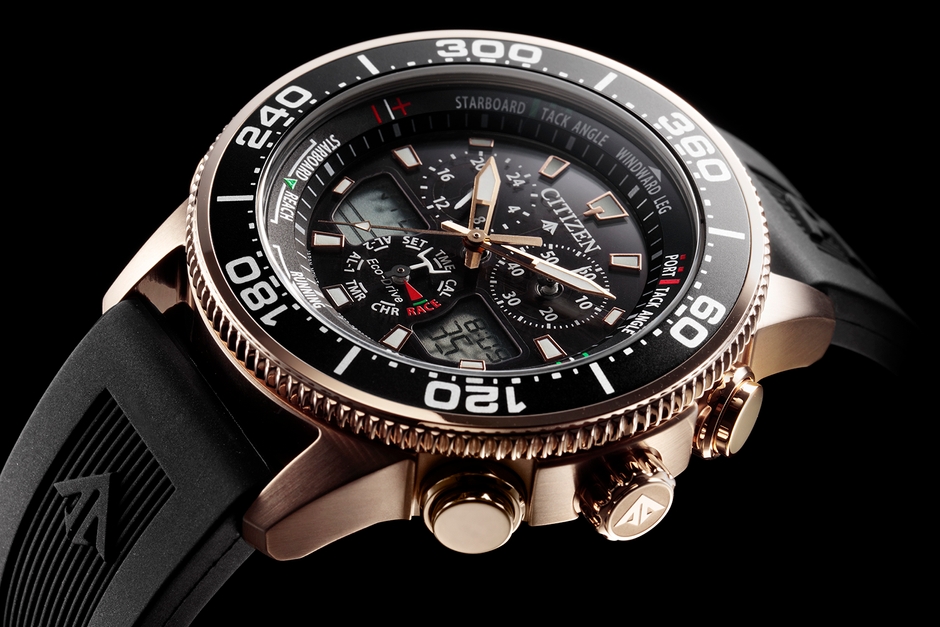 1989年に誕生した『プロマスター』は数々のヨットレースをサポートしてきました。プロマスターブランド誕生30周年に当たる今年、ヨットレースに必要な機能を搭載した エコ・ドライブ ヨットタイマーを発売します。本モデルに搭載したムーブメントCal.C660は、シチズンが独自に開発したアナログとデジタルのコンビネーションが特長です。ヨットレースに求められる「カウントダウン」から「カウントアップ」へとダイレクトに繋がるレースタイマー機能、世界各地を転戦する際に必要なワールドタイム機能などを持つハイスペックな仕様です。また、ヨット計測機能を持たせたベゼルと見返しリングを備え、本格的なヨットレースに対応しています。20気圧という高い防水性能に、定期的な電池交換が不要の光発電エコ・ドライブ搭載、スポーツラグジュアリーというトレンドを意識したデザインとカラーリングで、タウンユースにもマッチします。
