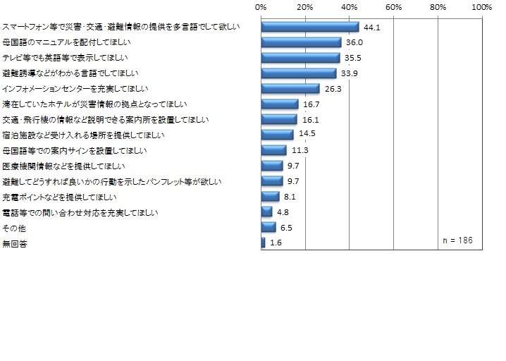 ・災害発生時に希望する対応は「スマートフォン等で災害・交通・避難情報の提供を多言語でしてほしい」が44.1%、「母国語のマニュアルを配付してほしい」が36.0%、「テレビ等でも英語等で表示してほしい」が35.5%、「避難誘導などわかる言語でしてほしい」が33.9%と、WEB・紙・テレビ・現地でのアナウンス等、様々な媒体・シーンで多言語での情報提供が求められている。