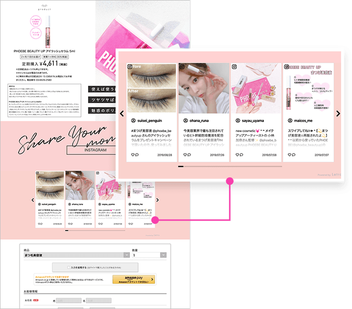 当社が提供するLetroにおいても、美容・コスメ業界のD2Cをはじめ、様々なD2CブランドにおけるInstagram上のUGCのクリエイティブへの活用を支援してきました。ECサイト、ブランドサイトなどのクリエイティブとして活用し、効果測定を行うことで、どのようなUGCが成果に繋がりやすいかを可視化することができ、UGCの中から効果の高いクリエイティブを見極め、PDCAサイクルの質を高め、マーケティング施策のさらなる成果向上に繋げることができます。