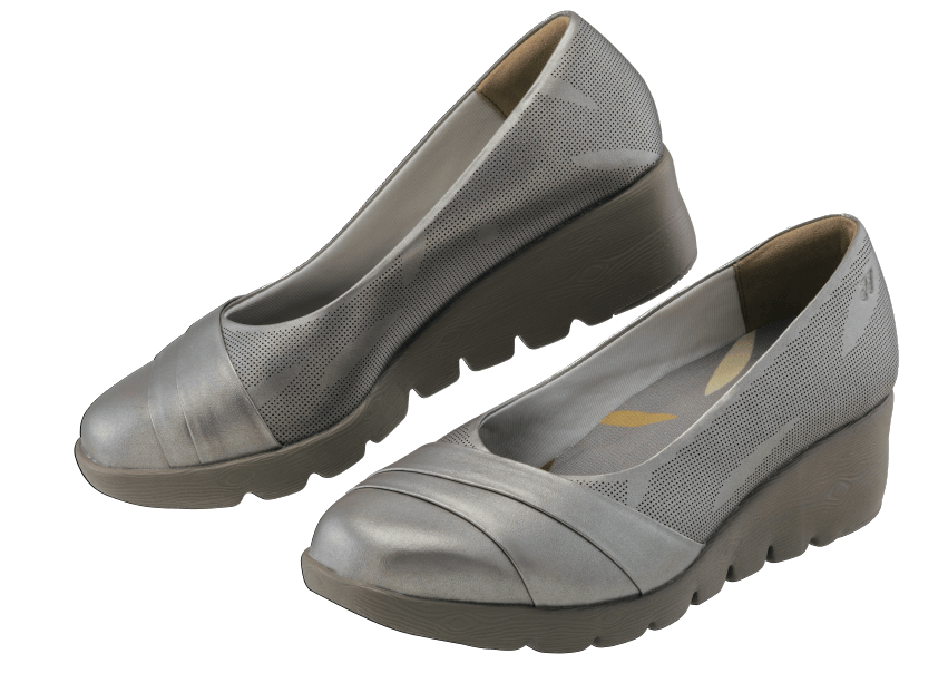 パワーバウンスウェッジソールは厚底のソールに踏みつけ部とかかと部にパワークッションプラスを搭載し、片足210g(23.0cm)という軽さとクッション感のある履き心地が特徴で、パンプスを履くと足やひざが痛くなりやすい、疲れやすいといった女性の悩みを解決します。