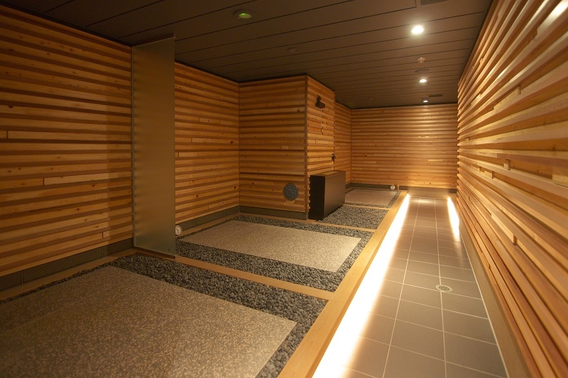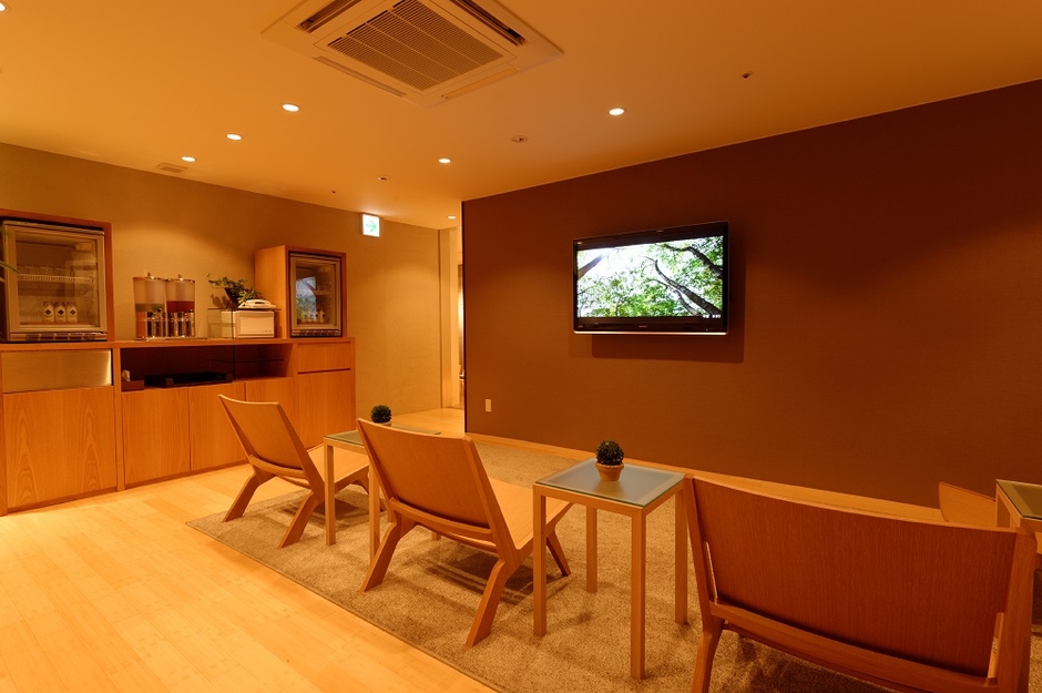 木のぬくもりに溢れ、やわらかい光に包まれた湯上り処。ヒーリング映像を見つめリラックスするもよし、目をつぶって瞑想しながらお好みのドリンクを片手にクールダウンするもよし。