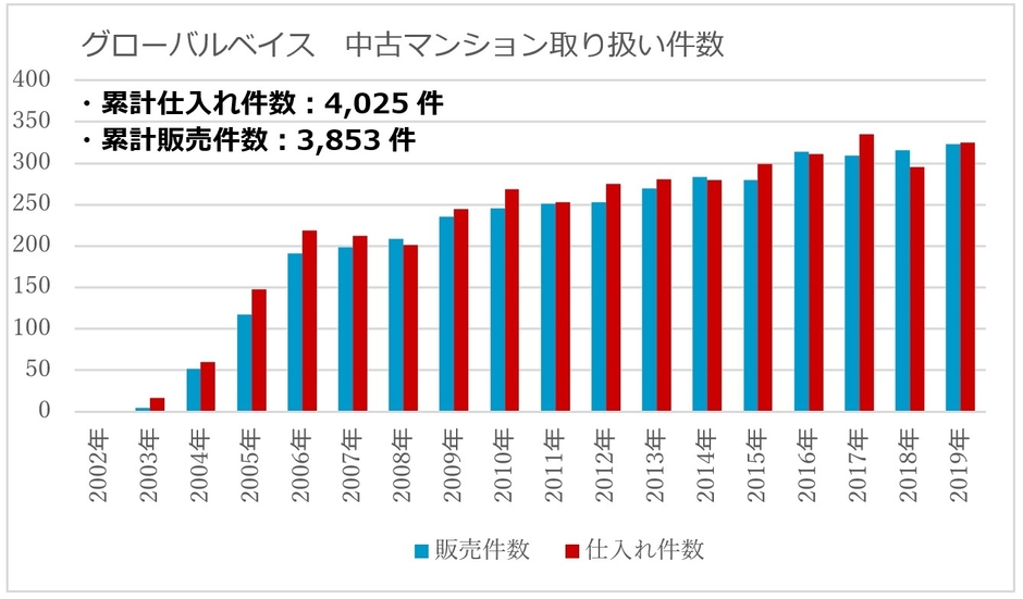 2002年よりグローバルベイスは都心好立地不動産の仕入れ、販売を行ってまいりました。創業当時は数件ほどだった物件調達件数、販売数はおかげさまで右肩あがりで成長し、現在は毎年300戸以上のマンションの仕入れ、リノベーション施工、販売を行っています。