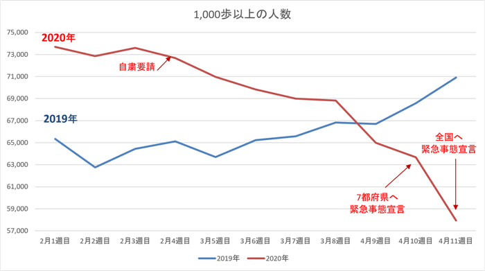 そこでこの度、当社が提供する歩数計アプリ【RenoBody】における全利用者の歩数データを基に、活動量の減少傾向を調査するとともに、下記の通りホームページ上で公開いたしました。また、自粛期間中の活動状況についてアプリ上でアンケートを実施したところ、11,000件を超える回答が集まりましたので、その結果も併せて掲載しています。
