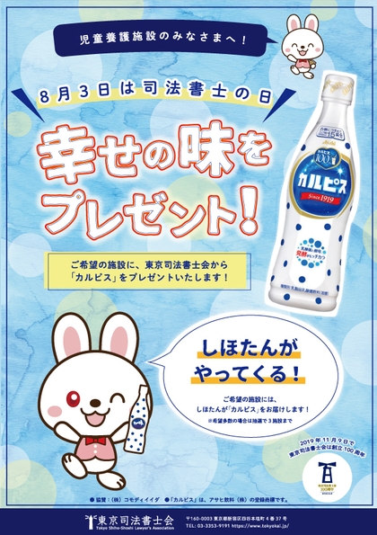 東京司法書士会(東京都新宿区四谷本塩町4番37号、会長:野中 政志)は、2019年11月9日で創立100周年を迎えることを記念して東京都が管轄する児童養護施設にアサヒ飲料株式会社の「カルピス」約2,000本を寄付する事業を実施することにいたしました。