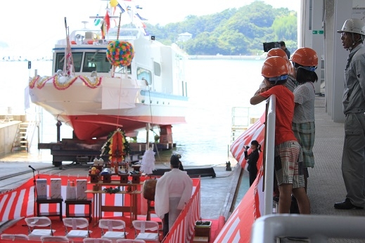 この日はTFCが建造した船の命名進水式も執り行われ、神主さんや巫女さんによる神事の様子や、進水の瞬間を子どもたちも関係者とともに静かに見守りました。