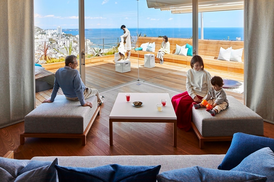 「星野リゾート リゾナーレ熱海」は、全室オーシャンビューの絶景が魅力のリゾートホテルです。2019年4月に改装した客室「テラスリビングスイート」で、三世代家族が思い思いに過ごすことができます。館内には海を望む温泉はもちろん、樹齢300年の楠に佇むツリーハウスや樹上アスレチック、屋内に白い砂を敷き詰めてビーチを再現したカフェなどがあり、滞在中にホテルから出ることなく、さまざまな体験をすることができます。