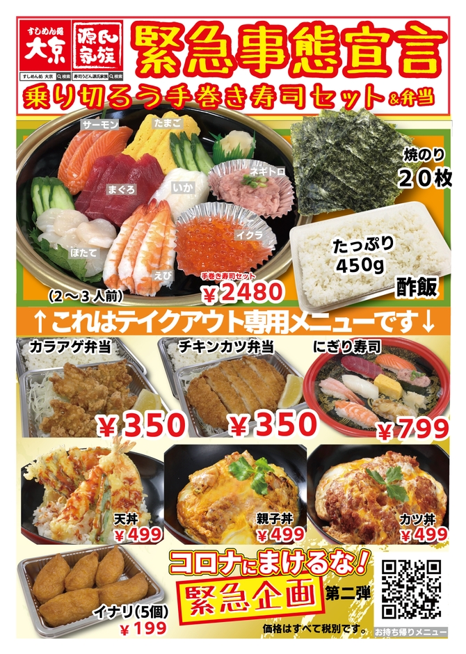 株式会社大京(本社:千葉県印旛郡酒々井町、代表取締役:三木 憲洋)が営業する和食ファミリーレストラン「すしめん処 大京」「寿しうどん 源氏家族」は2020年4月10日よりコロナにまけるな!企画第2弾として、特別テイクアウトメニュー『緊急事態宣言 乗り切ろう手巻き寿司セット・弁当』を全14店舗で販売いたします。