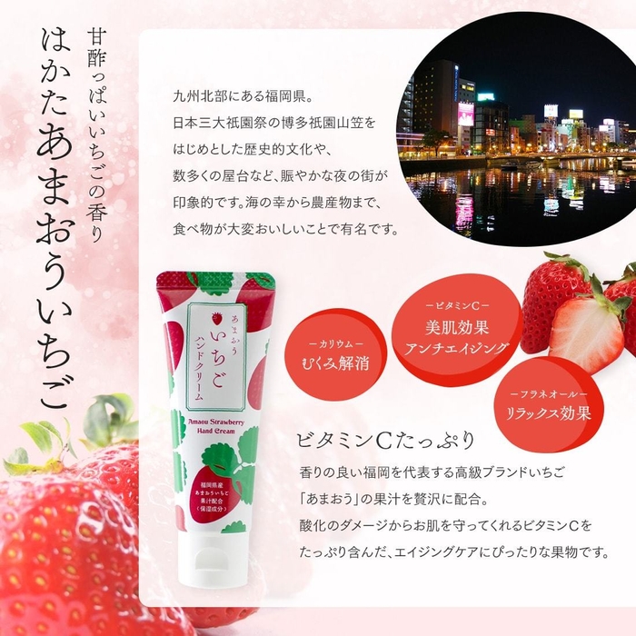 「はかたあまおういちご」「おおいたかぼす」「やまなしもも」といったラインナップで、3県の特産品である果物の果汁を贅沢に配合したフルーティな香りの3種のハンドクリームセットです。