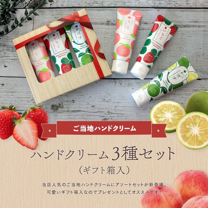 ■内容量 :3県ご当地ハンドクリーム3本(ギフト箱入)いちご・かぼす・もも