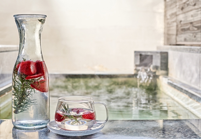ラベンダーやマンダリンオレンジといった9種類の天然アロマや、浅間山の麓、標高1,100mのハーブ園から栽培・抽出された約300種類のハーブエキスを使用し、約60種類の植物成分と海洋性成分をバランス良く配合した「ハナカルハーバルエッセンス」を使用したスパトリートメント。施術前にお部屋や大浴場で保温効果に優れた温泉でゆっくりと半身浴しながら身体を温めることで、スパトリートメントの効果も高めることができます。