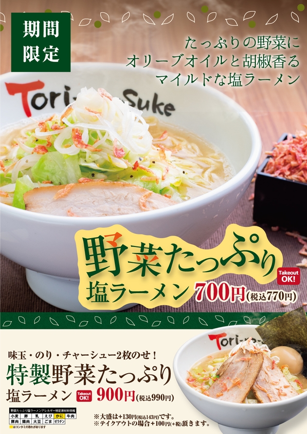 株式会社ウィズリンク(本社・広島県広島市安佐南区伴南 代表取締役社長 富谷薫)が展開するフランチャイズラーメンチェーン「とりの助」では、9月18日(金)から期間限定で「野菜たっぷり塩ラーメン」を発売します。
