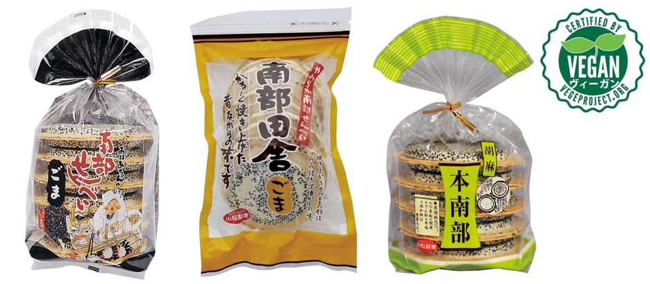 東北のソウルフード「南部せんべい」を製造販売している老舗・株式会社小松製菓(南部せんべい乃 巖手屋)は、11月27日(水)にヴィーガン認証(NPO法人ベジプロジェクトジャパン)を3商品にて取得しました。肉や魚はもちろん、卵や乳製品を含む、動物性食品を一切口にしないヴィーガン(完全菜食主義者)は海外にも多く、今回のヴィーガン認証により、ヴィーガンやヴィーガンライクなライフスタイルを好む外国人の方などにも安心して召し上がっていただけるようになりました。NPO法人ベジプロジェクトジャパンが認定するヴィーガン認証としては、せんべいで世界初となります。(現在も2品追加申請中)