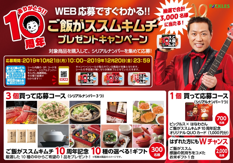 株式会社ピックルスコーポレーション(本社:埼玉県所沢市、代表取締役社長:宮本 雅弘)は、2019年10月21日から「ありがとう!!10周年 ご飯がススム キムチプレゼントキャンペーン」を全国で実施いたします。