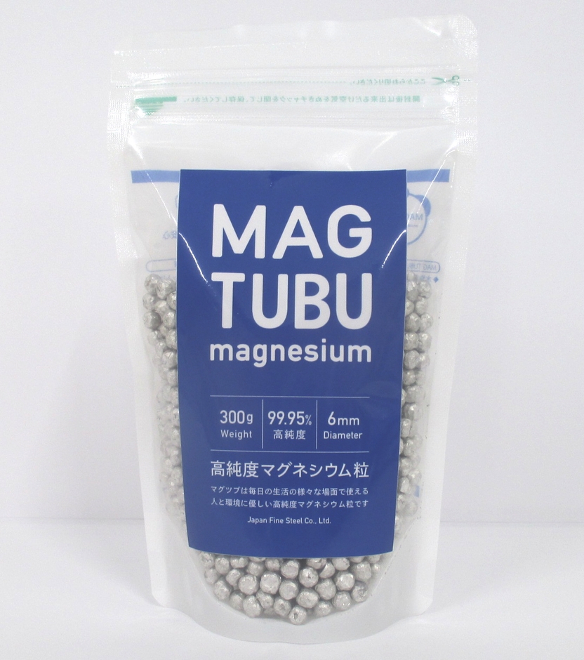 「MAG TUBU」は純度99.95%以上の高純度マグネシウム粒です。マグネシウムは水と反応することで、水素が発生し、水がアルカリ性となります。この性質を生かし様々な場面でご使用いただけます。