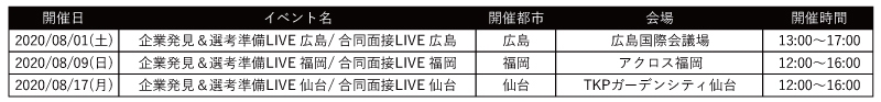 8月の『リクナビ2021』合同企業説明会は、3県で3件の開催を予定していました。また、同じく『リクナビ2022』の就職活動準備の合同企業説明会は、1県で1件の開催を予定しておりました。どちらも9月以降につきましては、事態の状況変化を見極めながら再開を検討いたします。