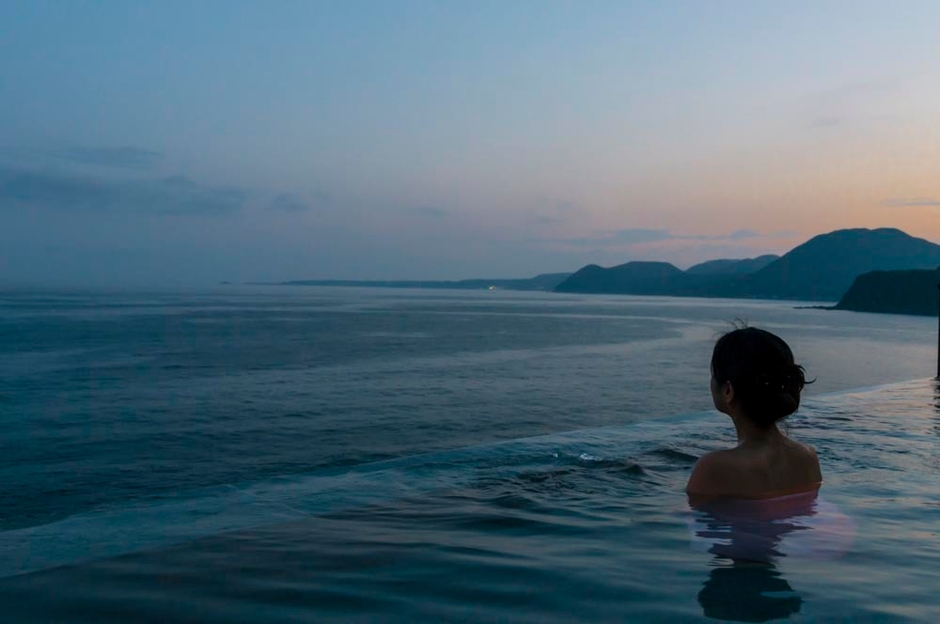 恵まれた立地を生かし、全客室が海を一望するロケーション。この景観を最大限に生かすことをコンセプトに、潮騒倶楽部のリニューアルとともに女性露天風呂もリノベート。7階、女性大浴場に併設した露天風呂「蒼空(そら)」。