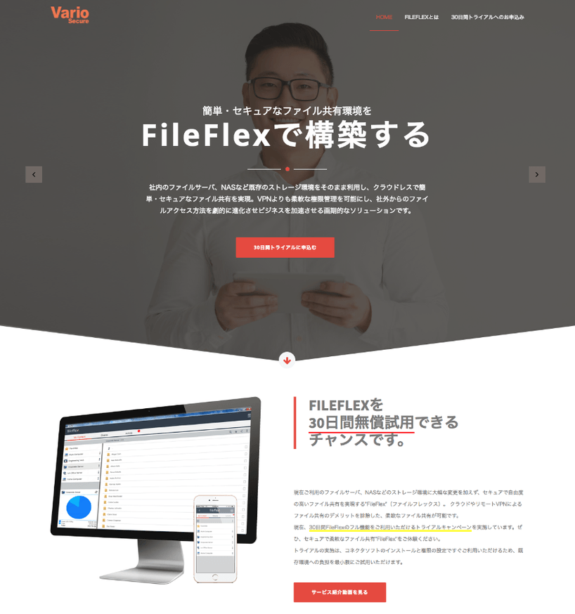 ファイル共有ソリューション「FileFlex」の国内初の提供開始を記念し、現在「30日間無償トライアルキャンペーン」を実施しています。クラウドやリモートVPNでのファイル共有や、テレワークやリモートオフィスのソリューションをご検討の企業様に30日間FileFlexのフル機能をお試しいただけるチャンスとなりますので、この機会をお見逃しなく次世代のファイル共有をご体験ください。