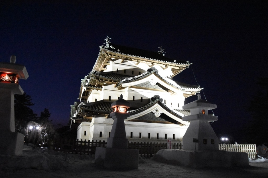 『弘前城雪燈籠まつり』は四季を彩る祭りのひとつで、1977年(昭和52年)から北国の冬を楽しく演出しようと開催。雪化粧した天守がライトアップされるほか、約150基の雪燈籠や300基を超えるミニかまくら群が幻想的な風景を作りだします。