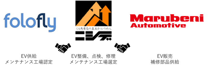 EVメーカー フォロフライ、西出自動車工作所、 丸紅オートモーティブの3社による車両整備網構築及び 補修部品供給における業務提携を開始