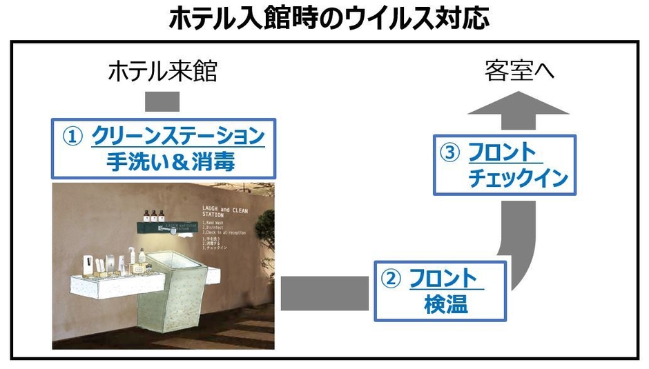 誰もがクリーンな状態でホテルに入館できる仕組みとして、ホテルロビーに外部からの菌を持ち込ませないようにする「クリーンステーション」を設置します。来館したお客様に、ウイルスが飛散しないように設計された医療用水栓による手洗いを行っていただきます。また手指や衣類などを消毒するアイテムを揃えたカウンターで、気になる所を全て消毒できるようにします。