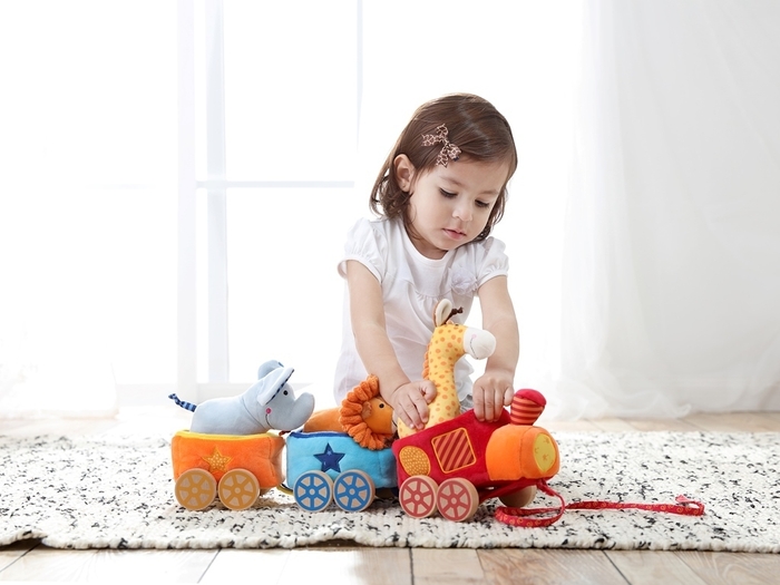 ドイツ・シギキッド社製。布でできた電車に3匹の動物のぬいぐるみを乗せて引っ張るおもちゃで、布製の部分は手洗い可能です。