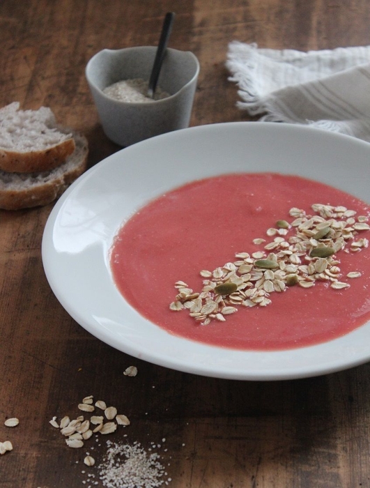 写真下:ビーツとさつまいものスープ。ビーツのきれいなピンクのコントラストが春らしさを際立たせます。