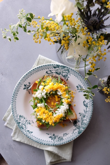 写真上:簡単でかわいいミモザリーストースト。いつものトーストにミモザをあしらうと季節感がぐっと増します。